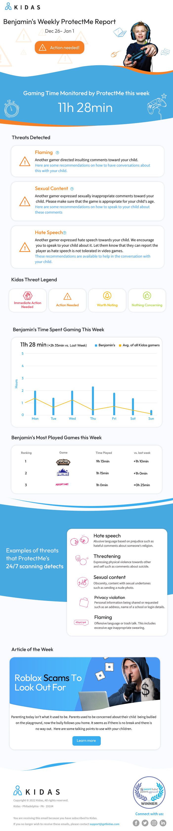 As part of the Service, Kidas automatically reviews the online activity of the child or children you register under your account (“Registered Child” or “Registered Children”), including activity conducted through text messages, voice conversations and/or interactions with games or other applications (each a “Covered Application”) on the child’s gaming device. Kidas provides the Account Holder (“you” or “your”) with email alerts flagging signals of cyberbullying, depression, online predators, and other potential dangerous activity that our proprietary artificial intelligence system (“AI System”) detects through review of each Covered Application. The email alerts may also provide educational material to give you background information regarding the virtual content the AI System has detected your child has accessed in the monitoring period, including new Internet trends, slang, and abbreviations, amongst other topics. The Service currently supports English language interactions only.